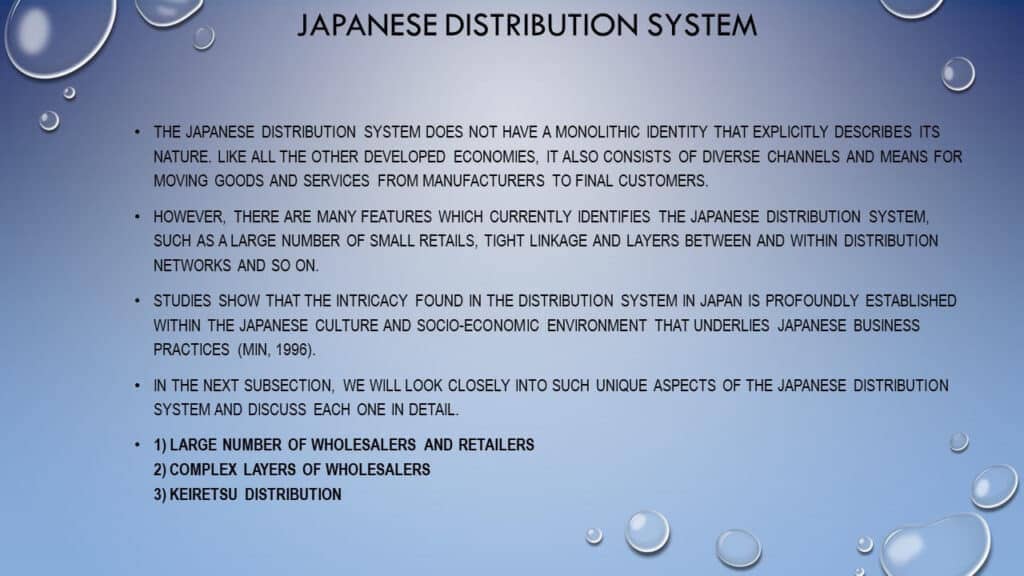Studies show that the intricacy found in the distribution system in Japan is profoundly established within the Japanese culture and socio-economic environment that underlies Japanese business practices (Min, 1996).